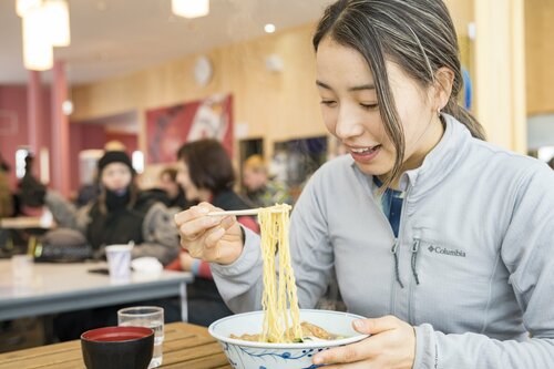 気になるメニューはというと、カレーやラーメン、うどんなど、体の温まるメニューが充実。なかには、長野名物の山賊焼きをトッピングしたラーメンやカレーもある。また、スキー場は海から30kmほどの距離にあり、新潟県糸魚川市で水揚げされた新鮮な海鮮メニューまで味わえるから驚きだ。しかも、サラダやおしんこ、みそ汁はお食事を注文された方には無料セルフサービス。みそ汁は魚のアラが使われているから何とも贅沢だ。