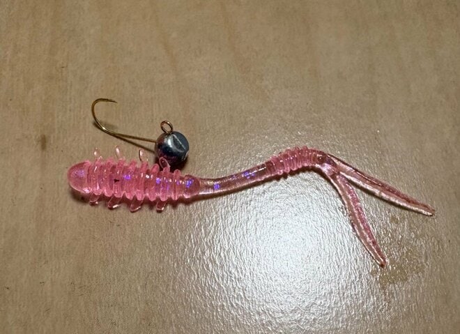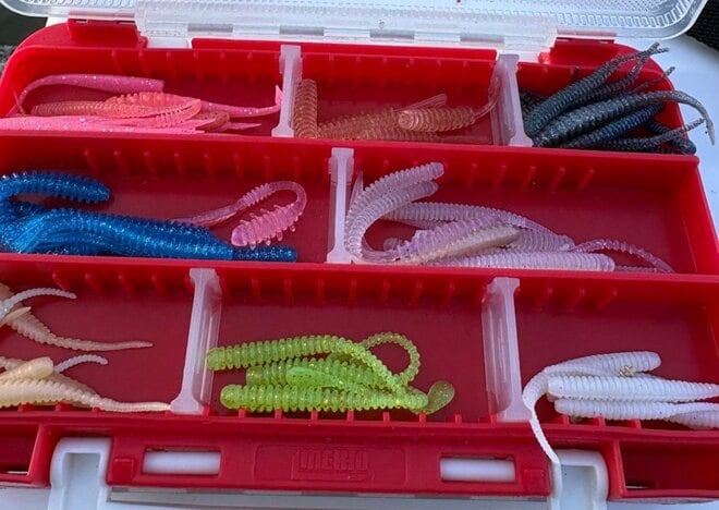 ワームの大きさは2インチ前後に限定。色は3タイプでOK(ナチュラル系・クリア系・目立つ色)。筆者はこれまでの実績からピンクのツインテールを最初に使うことが多い。これらのワームで反応が薄い時は、匂い付きのワームを使うと、ヒットを得られるケースがある。