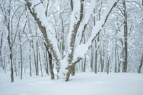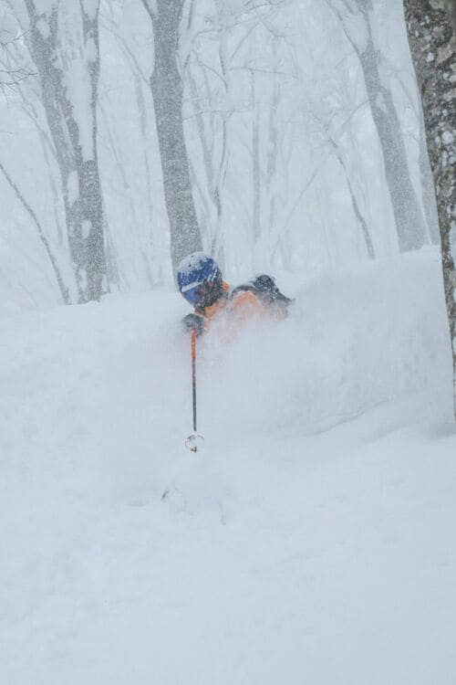 深い雪が降り積もったブナの森は、滑り手たちを優しくふんわりと包み込みます。