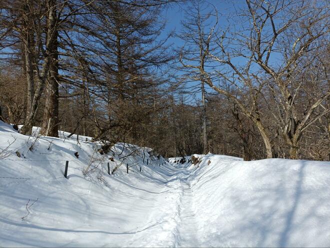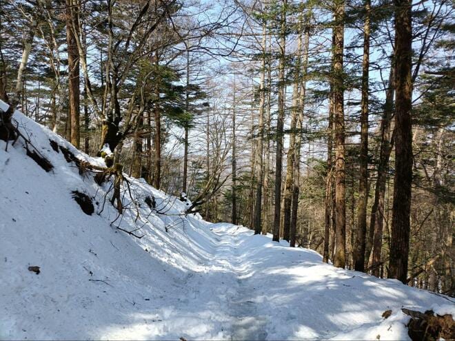 登山のスタートは、県営無料駐車場のある「三ツ峠登山口バス停」から。登山道にはしっかりとした踏み跡があり、6本爪の軽アイゼンを装着すれば滑る心配も少ない。道は広く緩やかな登りが続き、迷うポイントもない一本道だ。