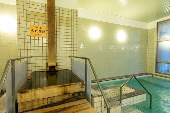 まず「サンテインおたり」の特徴は、すべて自家源泉(下里瀬温泉)の天然温泉であること。泉質はナトリウム炭酸水素塩・塩化物温泉で、疲労回復、神経痛、筋肉痛などの効用があるとのこと。浴室内には、この源泉をそのままかけ流している冷泉の浴槽もあります。