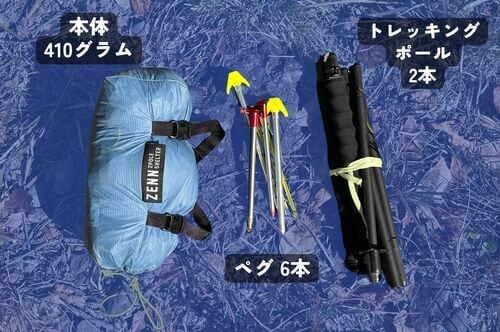 設営に必要な物は、重量410gの本体、ペグ6本、トレッキングポール2本(105cm~125cmまで対応)です。トレッキングポールは行動中に使えるので、しっかりコンプレッションすれば500mlペットボトル1本分ほどの大きさと重さの本体を持つだけで、居住空間を確保することができるという優れものです。