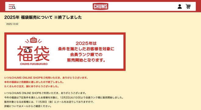 アウトドアブランドのCHUMS(以下、チャムス)では、毎年冬に福袋を販売している。 公式通販サイト「CHUMS ONLINE SHOP」から、条件を満たした会員のみ購入可能で、そのお得感が注目され例年完売となる人気商品だ。この度2025年12月に運よく福袋を購入することができたので、内容について詳しくレポートする。