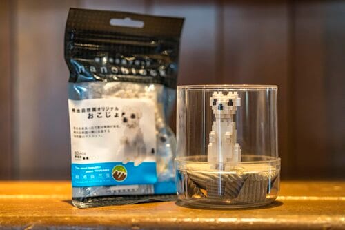 お店の人に「最近はこれが売れ筋」と教えてもらった新商品が「おこじょナノブロック」。世界最小級のブロックを使っておこじょを組み立てるもので、最小ブロック1個あたりのサイズは縦横高さがわずか4×4×5mmという。