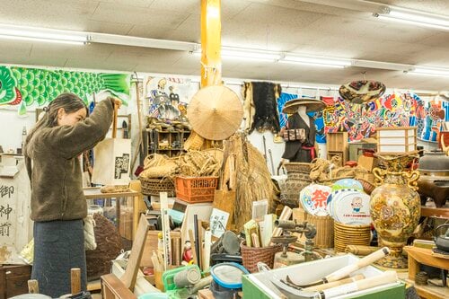 パン屋を出ると、通りの向かいになにやら気になるお店がある。古物店「みなとや」というこのお店は、外にも店内にも所せましと古民具が並んでいる。たんすなどの家具、さまざまな食器・漆器、農具、着物の生地など村の歴史を感じられる多種多様な民芸品がみっちり。古くは衣類や文具などを売るお店だったそうで、村内の蔵から出た不用品を引き取って販売するようになったのだとか。宝探し気分でショッピングが楽しめる、穴場的なお店を見つけた気分だ。