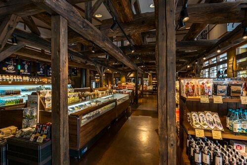 村の中心部から国道148号線を北上したところにあるのが「道の駅 おたり」。ここは村の特産品がギュッと詰まったショッピングスポット。売店コーナーの装飾は小谷村などの古民家の古木を組み上げたもので、太い梁や柱から雪国らしさが感じられる。