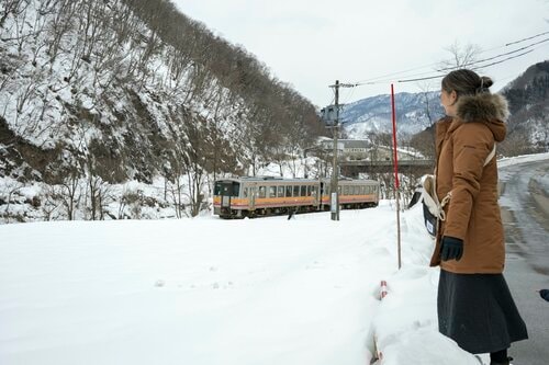 小谷村を走る大糸線は、長野県の松本駅から新潟県の糸魚川駅を結ぶローカル線。村のメイン道路となる国道148号線と同じく、姫川沿いに走行しているため、村内を観光しながらあちこちで列車を目にするタイミングがある。1車両または2車両のこじんまりとした列車が、鉄橋を通って川を越えたり、雪景色の中を走ったりする姿が愛らしい。雪景色と列車は写真映えもするので、時刻表をチェックして列車が見えるポイントで待ち構えておくのもおすすめだ。