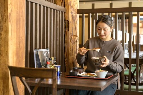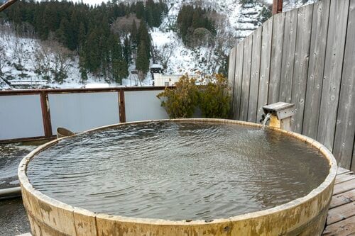 「道の駅 おたり」は温泉施設「深山の湯」も併設しているところが便利。温度の異なる2つの源泉があり、内湯には体がしっかり温まる「熱湯」と、ゆっくりくつろげる「ぬる湯」がある。岩の露天風呂もあるので、冬は雪見の湯浴みが格別だ。「かまど飯処 鬼の厨」で500円以上のメニューを注文すると、ソフトドリンクが割引になったり、深山の湯の入浴料が半額になったりお得が多い。食事と温泉はセットがベストだ。