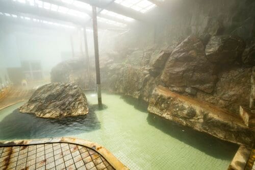 建物1階にある「自然大岩風呂」は、天然の岩をそのまま大浴場にしたもの。混浴だが、女性専用の時間帯がちゃんと設けられている。源泉かけながしの湯は、3km離れた姫川上流から引湯したもの。湯は64℃ほどで、適温になるよう調節されている。