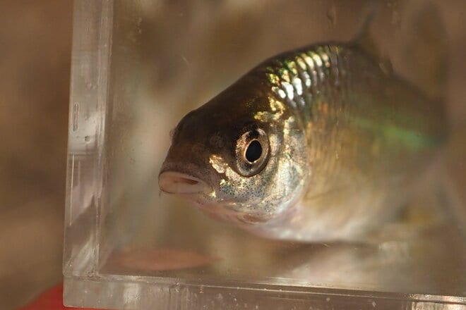 魚種ごとに見られる特徴的な婚姻色が出ていないため断定は難しいものの、体高やヒレの大きさ、口元のヒゲの長さなどから、これは霞ヶ浦水系の在来種である「アカヒレタビラ」だと判断した。