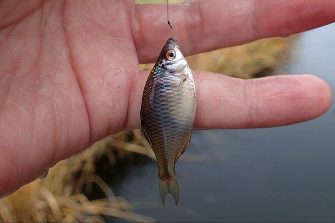 そんな釣りの終盤、ほっそりとした体形の魚が掛かった。一瞬、小ブナかと思ったが、体側にうっすら浮かぶ青い縦縞に目が留まり、違和感を覚えた「これは在来タナゴだ!」。