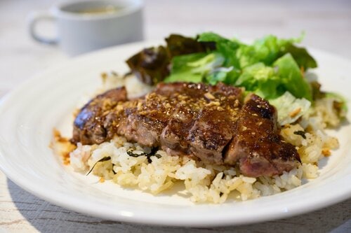 建物2階にある「レストハウスやまびこ」の定番人気メニューといえば「野沢菜ガーリックステーキライス」。その場で焼き上げる熱々のオーブン料理もあり、「紅茶鶏のコンフィオーブン焼きバゲット添え」など、ゲレ食とは思えぬおしゃれなメニューも揃う。