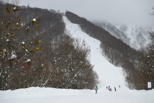 ゲレンデ山頂エリアから違うルートを通って、ベースに下りるルートもおすすめだ。「やまびこエリア」から「Eコース」を降りて滑り込める「スカイラインコース」は、尾根沿いを通る全長4,500mのロングコース。コースは緩急に富んでおり、見晴らしの良い尾根のストレートバーンや、木々に囲まれたカーブなど変化があって楽しい。また、途中から枝分かれするコースを降りて、長坂や柄沢のベースへと降りていくことができる。ルートの選び方によって、緩斜面や中斜面、急斜面のパウダーエリアまで多彩なコースを体験可能だ。