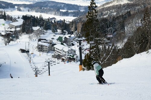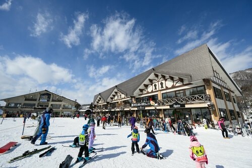 急斜面を降りきると中斜面の「チャレンジコース」と合流し、そのまま「ユートピアBコース」を繋いで日影エリアのベースへと滑り切ることができる。日影エリアは温泉街から「遊ロード」という長いエスカレーターでアクセスできるゲレンデ玄関口のひとつ。スキースクールやスキーセンター、レストラン、レンタルショップ、キッズパークなどが集まる賑やかな場所だ。