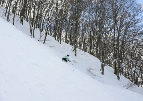 「パラダイスゲレンデ」の下部から林間コースに滑り込み、日影ゲレンデまで滑り通すと、山頂から10kmに渡る最長滑走をコンプリートできる。だた今回は最大斜度39°の急斜面が待つ「チャレンジ39度のカベ」を攻略することに。滑り出しはコースの先が見えないほどの急斜面なので、慎重に進むとその先に斜度感のあるワイドバーンが広がっている。