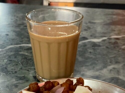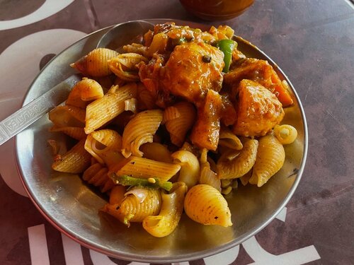 なかでも僕のお気に入りは朝食メニュー。パスタ、アルー(じゃがいも料理)、チヤ(ミルクティー)のセットで、たったの100ルピー。日本円にして約109円。町の食堂よりも少し安いのがうれしい。そして、ちゃんと美味い。