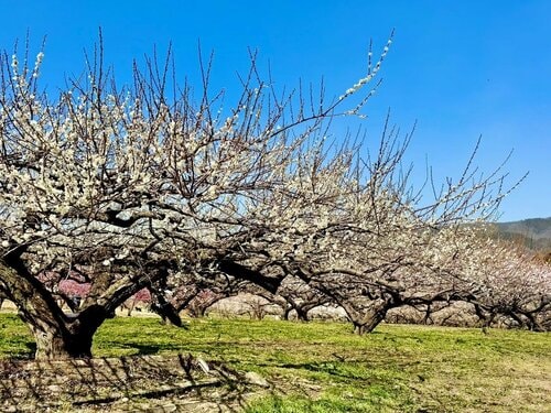 取材に訪れた2月14日時点でまだ全体では3分咲き程度。品種は「白加賀(しらかが)」や「梅郷(ばいごう)」をはじめ、さまざまな品種の梅が植栽されています。「白加賀」は白い大輪の花を咲かせる代表的な品種で、梅干しや梅酒の原料としても知られています。「梅郷」は豊かな香りが特徴で、観賞用としても人気があります。近年では、徳島県原産の「月世界(げっせかい)」など新たな品種の植栽も進めており、白・赤・ピンク・黄色と多彩な花色が丘陵地帯を彩ります。