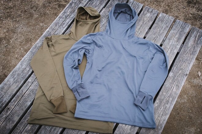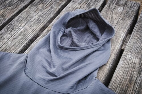 今回紹介する「フーディーサムホール」は2025年秋に登場した、グリッドテックプラスの最上位モデル。その名が表す通り、長めのカフ部分には親指をかけることのできるサムホールが、頭部にはフードを装備することで、寒さを感じやすい首元と手首をしっかりとカバーしてくれます。