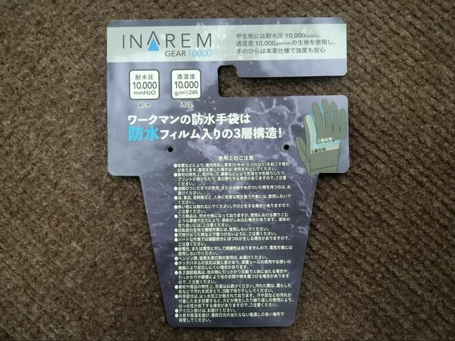 ワークマンにより独自開発された素材で、「イナレムギア防水防寒グローブ」には耐水圧10,000mm、透湿度は10,000g/平方メートル/24hの性能をもたらしている。水の侵入を防ぎながら、水蒸気を外へ逃がす機能を備えており、今回紹介した「イナレムギア防水防寒グローブ」だけではなく、レインスーツや防水防寒コート、ウォームパンツなどにも使用されている。