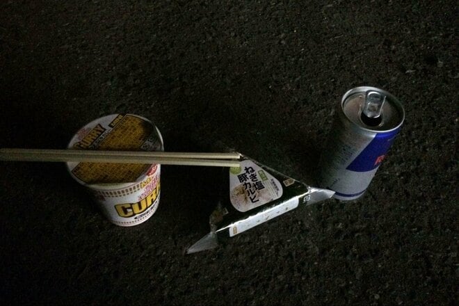 霧の中をゆっくり走っていると、コンビニが現れた。疲れもあったので休憩がてらコンビニに立ち寄り、夜食を購入することにした。辺りには筆者を除いて人や車の姿はない。店舗は多少年季が入っているものの、よくある田舎のコンビニだ。そこで、おにぎりとカップヌードルを購入した。店員は若めの男性だったのを覚えている。