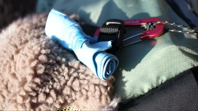 素早く水分を吸収するだけでなく、乾きが早いのも特長。ホックで留められるループがあるので、バッグの外側に取り付けておけば、バッグやポケットの中で迷子になる心配もない。