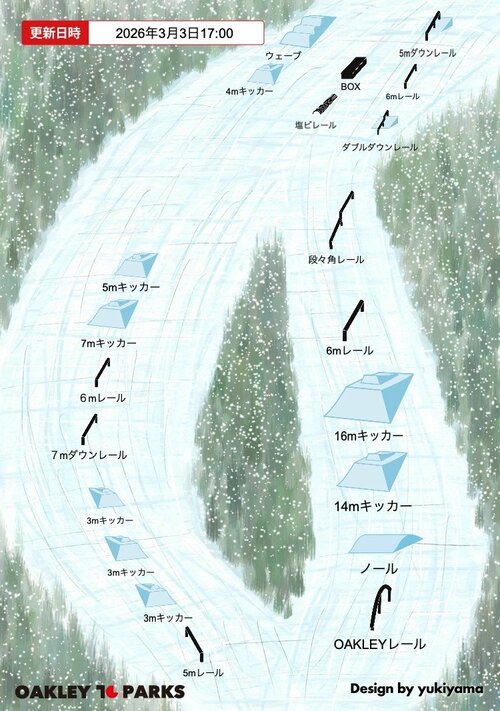 トップシーズンのパークは入り口付近にジブアイテム、そのすぐ下にバンクドスラロームを常設。斜面を下るとコースが2つに分かれ、右側の沢コースを進むと3mや5mのキッカーなど初級者向けのアイテムが並ぶ。各所にレースやボックスなどのジブアイテムもあり、スロープスタイルを楽しめるレイアウトになっている。