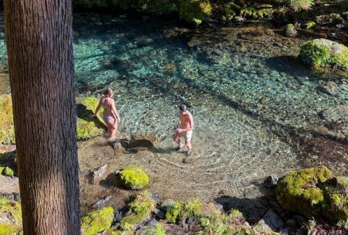水温の方が外気温よりはるかに高い。これは本当にすごいことであり、広大で豊富な伏流水がなせる奇跡だ。地中を流れる水は年中11℃近辺をキープしているため、夏は冷たく、冬は温かい川となる。数字だけ見れば冷たいはずなのに、不思議と入れてしまうのだ。