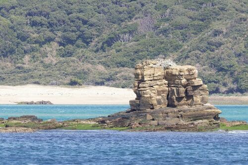 海から突き出す巨岩を眺めていると、岩の上に白く変色した枯れ木がたくさん積まれているのに気づきました。双眼鏡を目に当てると、その上には白い点が鎮座しています。ミサゴです。繁殖の時を迎え、抱卵をしているのでしょうか。じっと落ち着いています。