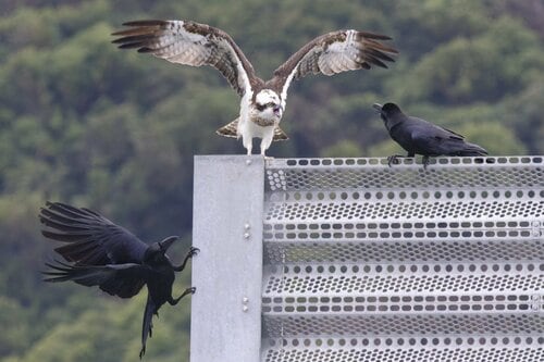 そのうち、横で見守っていたもう1羽のカラスが、ミサゴの下からちょっかいを出し始めました。金属板に縦に止まるという超ムリな姿勢からミサゴを挟み撃ちにする作戦のようです。ミサゴのイライラはMAXに。ついに本気モード炸裂! 翼を大きく広げ、片足を持ち上げながら鋭い嘴で強烈な威嚇を一発お見舞いしました。これには、カラスも「これ以上はヤバい!」と察したのか、慌てて逃げていきました。
