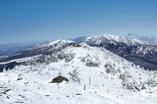 登りはひたすら直登の一本道なので、道迷いの心配はないだろう。1時間ほどで辿り着くなだらかな山頂には、天気が良ければ、雪化粧をした八ヶ岳や北アルプスを望む大パノラマが広がる。15分ほどの距離に北峰もあるので、天気が良ければ足を延ばしてみるのもいい。