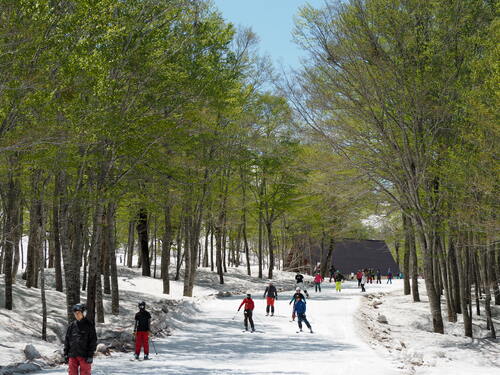 また、スキー場中間エリアにある「カモシカB」コースは一面がコブ斜面になり、こちらはコブ好きが集中。このエリアはブナが広がり、春は新芽をつけた森を通り抜ける気持ちいい林間コースもある。さらに山麓まで下ると、最後にバンクドスラロームが用意されている。春の奥只見は、ゲレンデのあちこちにアトラクションが用意されているので楽しい。