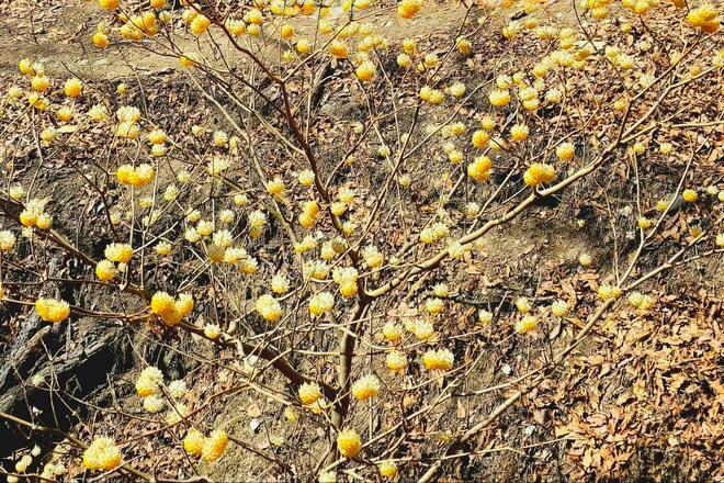 北摂に春の訪れを告げるミツマタの花。大阪府豊能町(とよのちょう)の吉川地区にあるミツマタ群生地は、イセコ谷といわれる谷筋に沿って群生しており、例年3月中旬から下旬にかけて、斜面一面が黄金色に染まる絶景スポットだ。今回は、能勢電鉄・妙見口(みょうけんぐち)駅から始まる、なだらかな里山風景が広がるルートとともに、北摂最大級の規模を誇る吉川地区ミツマタ群生地の魅力を紹介する。