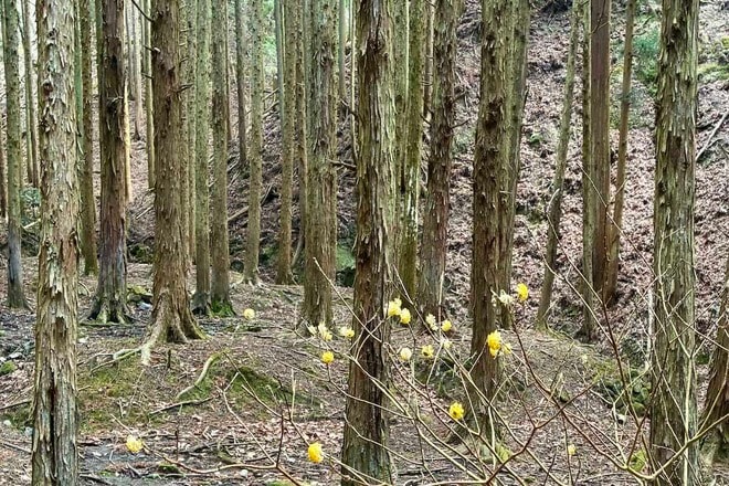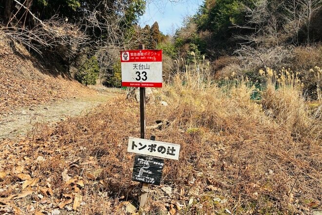 目的地についてだが、実は道中に「イセコ谷」や「ミツマタ群生地」と書かれた道標はほぼない。まずは「天台山33」と書かれた道標を探そう。その下の黒い案内板に、手書きで小さくミツマタと書かれているのが目印だ。ここを右に進み杉林に入る。その先にある「とんぼ池1〜2」の道標に従って進めば、目的地はもうすぐそこだ。