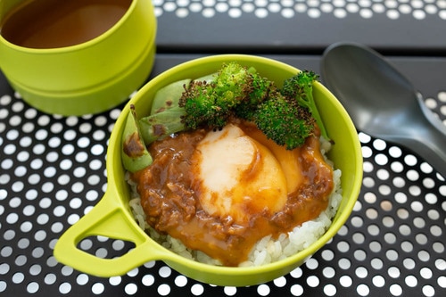 大豆タンパクは日清食品「カップヌードル」の「謎肉」の原料のひとつでもあり、かみ応えがあって、肉のような食感が味わえる。なので、このソースは単なる味付けだけでなく、具の役割も持っているわけだ。メインのたまごを崩しつつ、ソースと混ぜながら食べるとおいしそうだ。