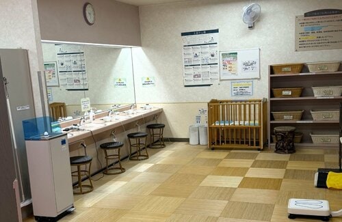 ドライヤー付きのパウダースペースや給水機も用意されていて、入浴後も快適に過ごせそうです。ベビーベッドもあるので、赤ちゃん連れでも利用しやすい環境が整っています。