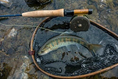 場所を上流へ移し、キャッチ&リリース区間の最上部へと移動しました。浅瀬から続く流れ込み。開始早々、流れに馴染ませたソフトハックルをひったくるような感触が伝わってきました。バラさないように丁寧に引き寄せて、ようやく1匹目を釣ることができました。