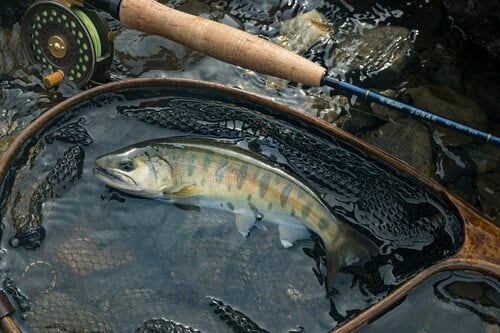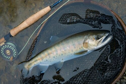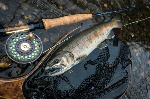 長い1番ロッドはストッピングパワーこそ弱いものの、長く繊細なティップ(穂先)が順応無尽に走る魚に追従してくれているので安心感があります。ようやく岸際に寄ってきたヤマメをネットイン。いかつい顔つきの尺ヤマメでした。