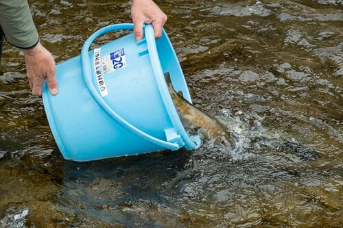 1匹釣ってからは膠着状態で、なかなか次が釣れません。顔なじみの漁協の組合員さんがやってきました。どうやらこの後、追加放流があるようです。フライフィッシングでは、放流された魚たちがすぐに釣れるわけではないのですが、新しい魚が入ることで、すでにいる魚たちの活性が上がるかもしれません。ゲームチェンジャー的な放流に期待が高まります!
