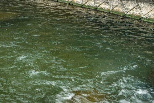ここにはかなり魚のストックがあるようで、流し方やフライを替えると反応があります。とはいえ、徐々に反応が鈍くなり、そろそろ諦めた方がいいような気がしてきました。最後に対岸のコンクリート護岸スレスレにラインを伸ばし、間の流れをかわすようにメンディング、しっかりと水流に馴染ませつつリトリーブ、フライを引っ張ってくると大きな魚影が鈍い光を放ちながら水中で身を翻しました。あきらかに大物です!