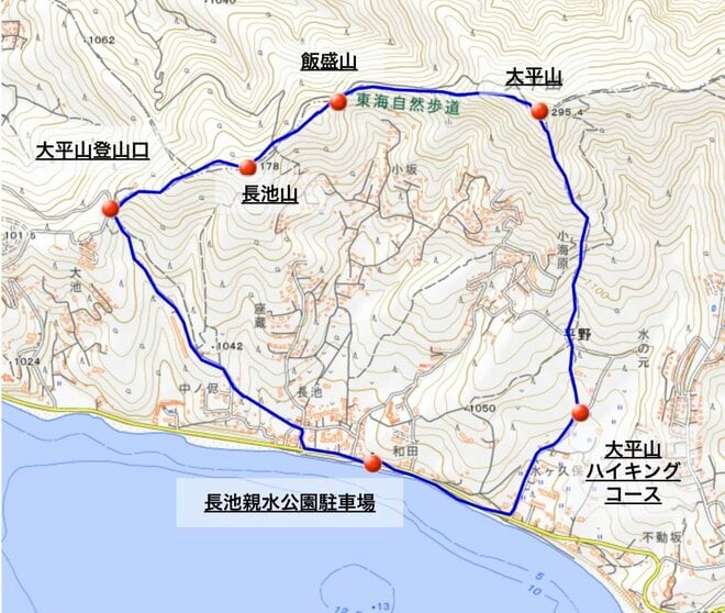 長池親水公園駐車場 (0:00) → 大平山登山口(0:40) → 長池山 (1:00) → 飯盛山 (1:10) → 大平山(1:40)→長池親水公園駐車場 (2:30)