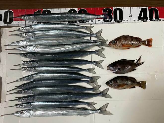 仕掛け:堤防胴突仕掛け7号、カワハギ用仕掛けハゲ針4号、サヨリ針4号