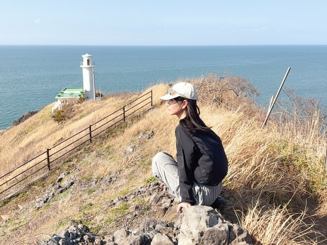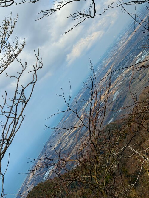ゆっくりゆっくり標高を上げると、景色がまた変わる。山頂あたりで目線をあげると広がるのは、海と佐渡島だ。足元ばかり見ていて気づかなかったが、まだ葉のない樹々の隙間から真っ青な海が見えた。「ふぅ……」と、お花に夢中になっていたが遠くの景色を見ながらひと休み。