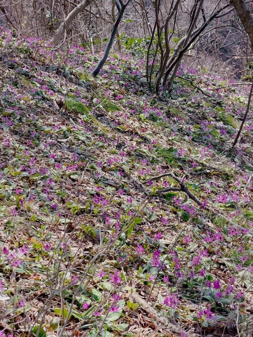 地上に姿を現すのは、わずか数週間だけ。だからこそ、この瞬間に立ち会えた喜びは大きい。うつむいて咲くその姿は、どこか控えめだが、斜面に一斉に咲いて圧倒的に美しい。ここまで歩いてきてよかったと、素直に思える瞬間だ。風に揺られる様子が紫色の波のように見えた。この群生の中から白いカタクリを探す宝探しにも夢中になった。