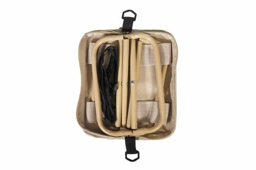 カラーは、自然に溶け込むベージュと、無骨な格好良さが光るブラックの2色展開。落ち着いた色味と、収納袋のファッショナブルなデザインは、こだわりのキャンプギアの中に置いても違和感なくフィット。