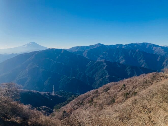 ヤビツ峠から大山山頂までは約1時間40分。日が長くなってきたとはいえ、短時間で登れるので初心者にも安心だ。山頂付近までは樹林帯を歩くが、冬枯れした登山道では木々の間から景色が見える。途中、湘南の街並みや相模湾が見える場所も多く退屈しない。さらに丹沢の山々に加え富士山を望めるスポットもあるため、景色を楽しみながら山頂を目指せる。