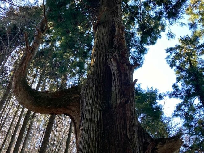 天狗岩からロックガーデン内を散策しながら50分ほどハイキングすると、「天狗の腰掛け杉」と呼ばれる立派な杉の木が現れる。枝が不自然に曲がっており、かつてこの木に天狗が腰掛けたとされる伝説からつけられたそうだ。