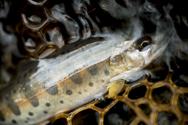 釣りを始めて約2時間。コカゲロウの集団ハッチや石の上で羽化したてのカワゲラたち。魚影を見ていないことを忘れて、虫たちの観察にすっかり夢中になっていました。水温は10.4〜10.8℃で、これまた申し分ありません。棲んでいるのはヤマメなのか、イワナか、はたまた両方か。それぞれの付き場を想像しながら丹念に釣り上がっていきました。ライズでもあればわかりやすいのですが……。