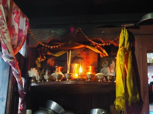 朝6時ごろに起き、まず「プジャ」と呼ばれる祈祷をおこなう。家の神棚のような場所で、灯明を灯し、お香を焚く(あくまで一例で家庭によって時間帯やスタイルはさまざま)。