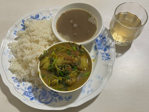 ダル(豆のスープ)、ご飯、そして副菜。ときどき肉がつくこともあるが、普段は野菜中心のシンプルな内容である。