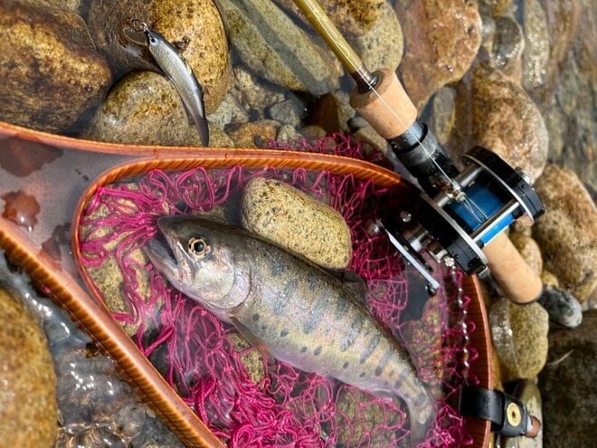 ピンポイントへのキャストが求められる場面が多い渓流釣りでは、キャストコントロールがしやすいベイトタックルは相性がよい。瀬の中の流れや石の際を、テンポよく狙って投げる釣りに向いていると言える。